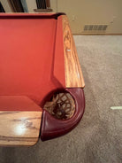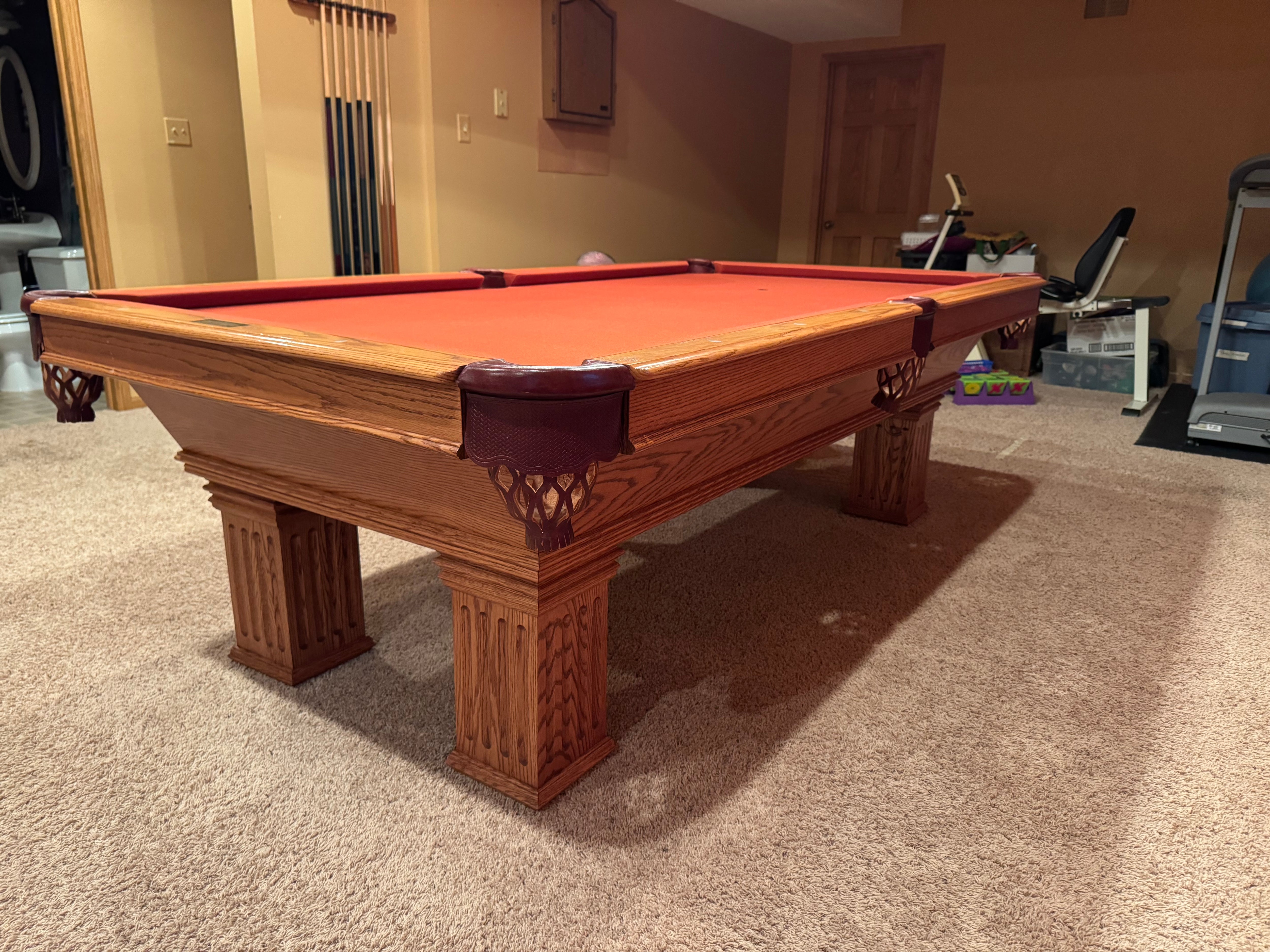 This beautiful Oak table features brown leather pockets, 1” 3-piece slate, tapered frame and fluted colonial legs. Included in the sale is new felt (you choose the color) set of balls, triangle, cues and professional delivery and installation within 50 miles of Lakeville, Mn.