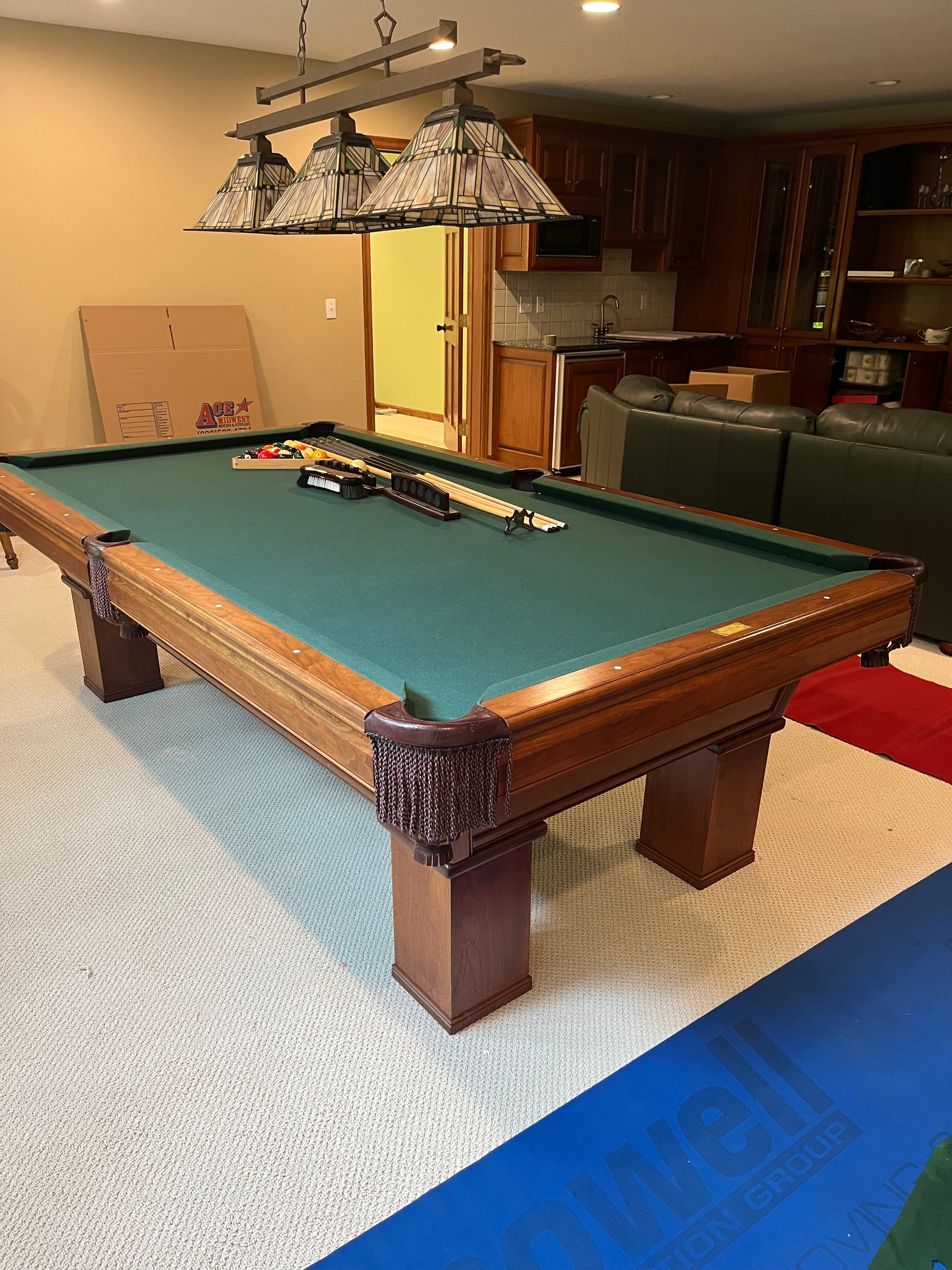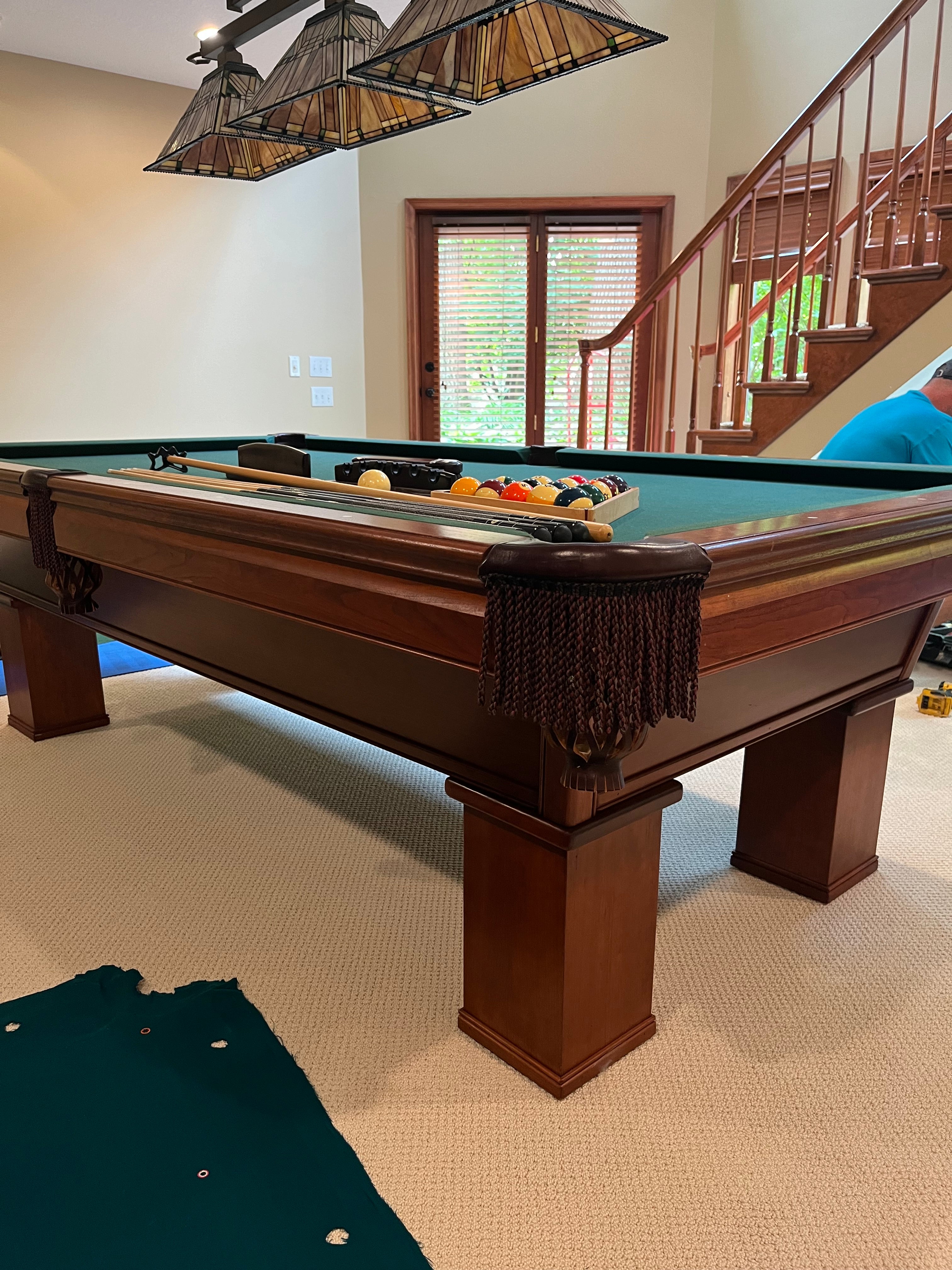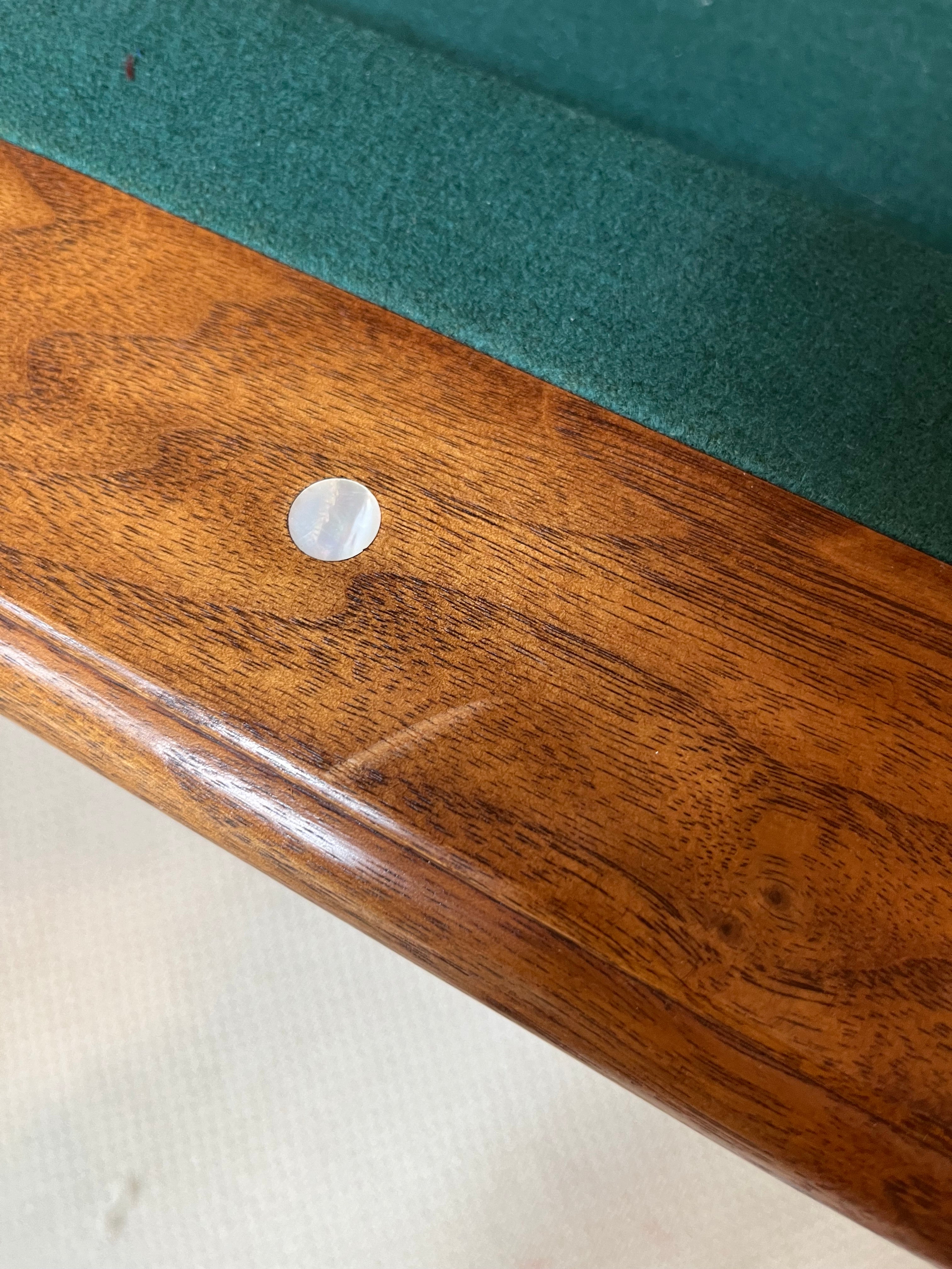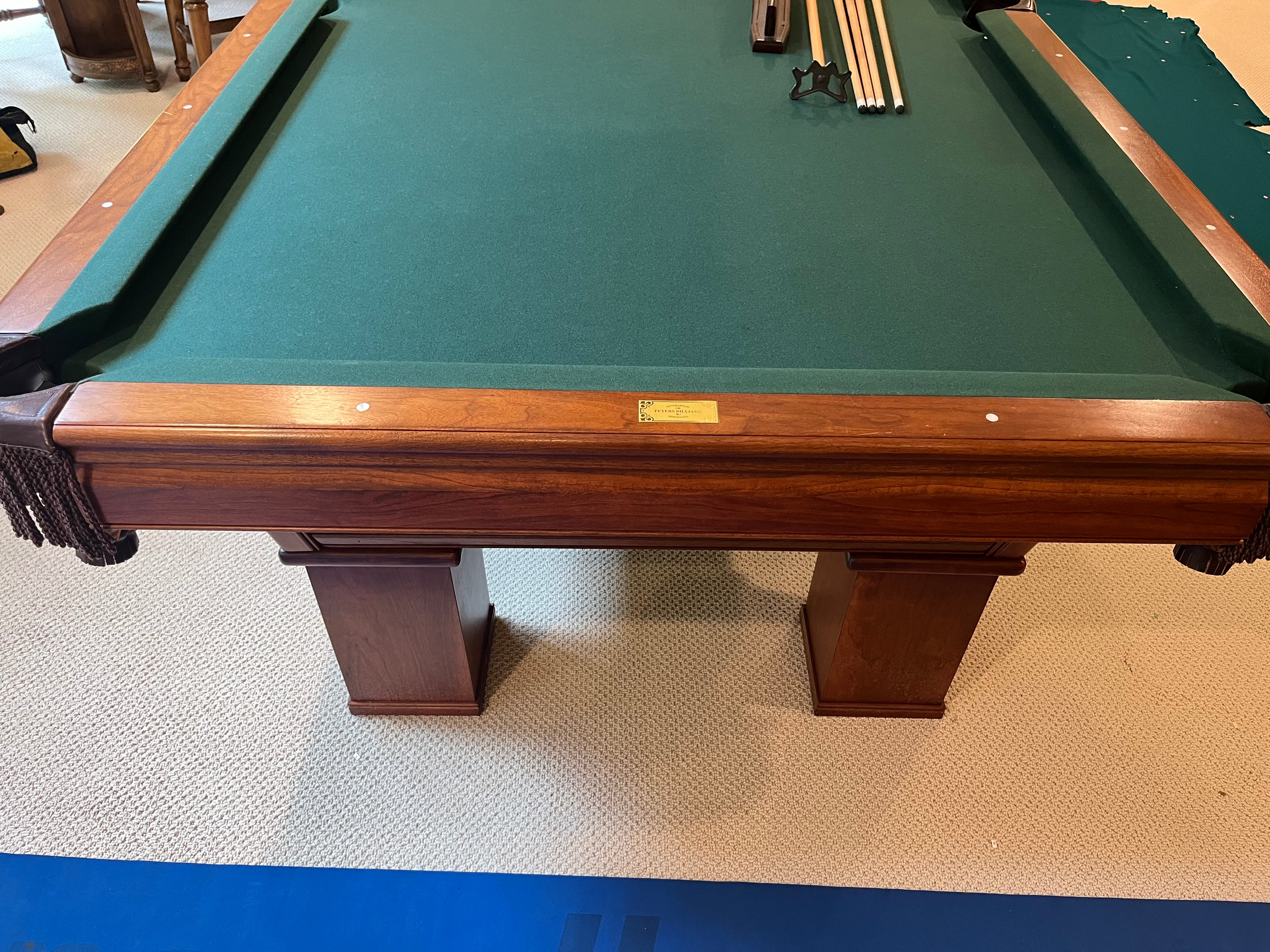 This is the Oxford model that is in excellent condition and is made up of solid cherry wood. It is a 3-piece 1" pinned Italian slate, leather pockets, new k66 cushions and new cloth (you choose the color). Lots of accessories included as well.